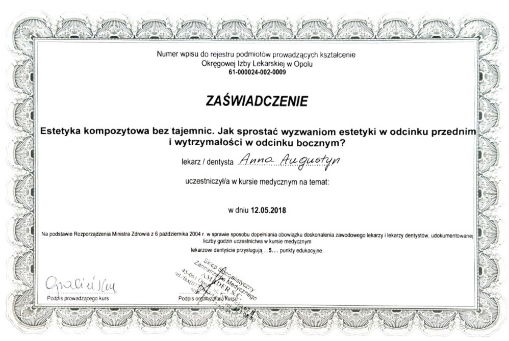 Ukończyła liczne kursy i szkolenia, stale podnosi swoje kwalifikacje. W naszym gabinecie koordynuje leczenie periodontologiczne pacjentów w terapii FMD i terapii fotodynamicznej.