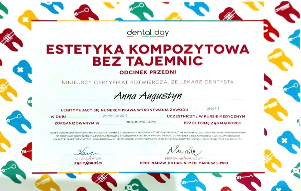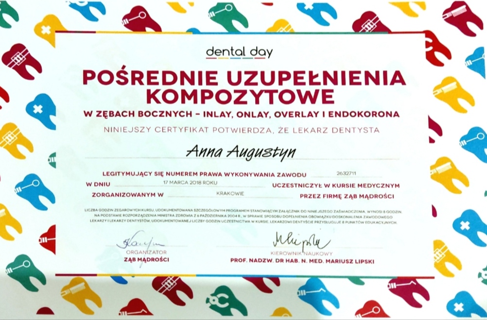 Wykonuje leczenie kanałowe pod mikroskopem nawet najtrudniejszych przypadków. Prowadzi leczenie periodontologiczne w protokole FMD w ścisłej współpracy z higienistką stomatologiczną.