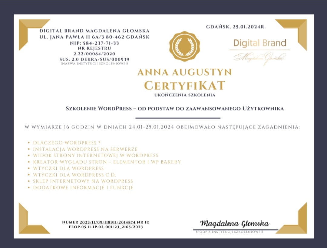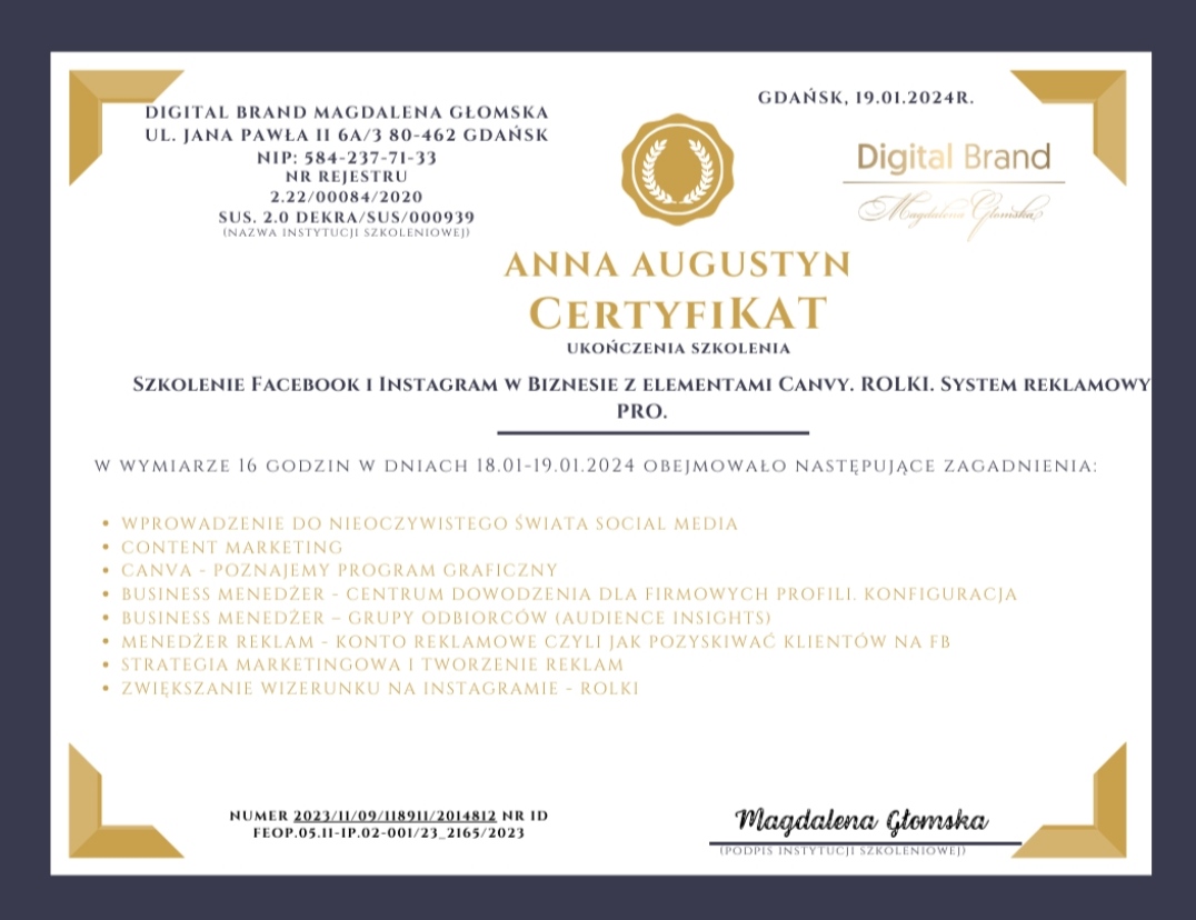 Stale podnosi swoje kwalifikacje na licznych kursach i szkoleniach.