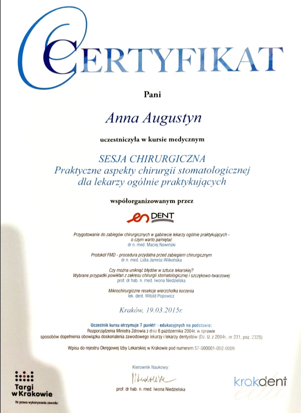 W naszym prywatnym gabinecie zajmuje się usuwaniem zębów zarówno tych prostych jak i bardzo skomplikowanych zębów, wymagających zaopatrzenia chirurgicznego. Usuwa wyrznięte i zatrzymane „ósemki”, zaopatruje rany po usuwaniu fibryną bogatopłytkową PRF stwarzając najlepsze szanse dla bezbolesnego gojenia i stworzenia najlepszych warunków na implanty zębowe. Zajmuje się wszczepianiem implantów oraz odbudową protetyczną na implantach.