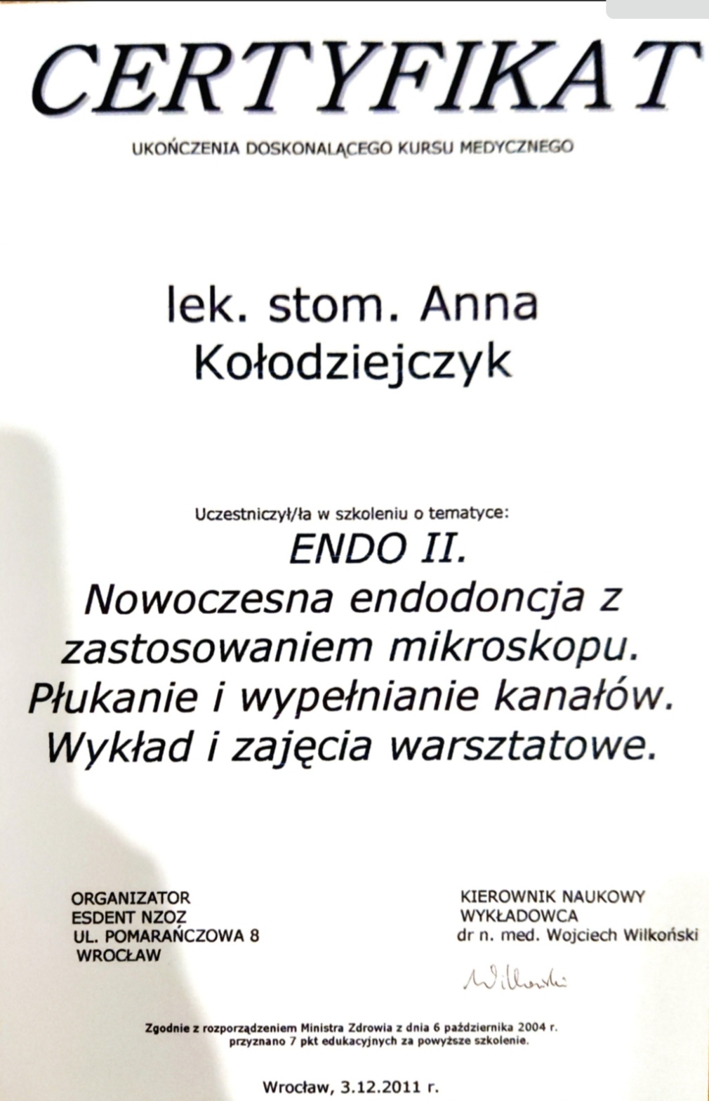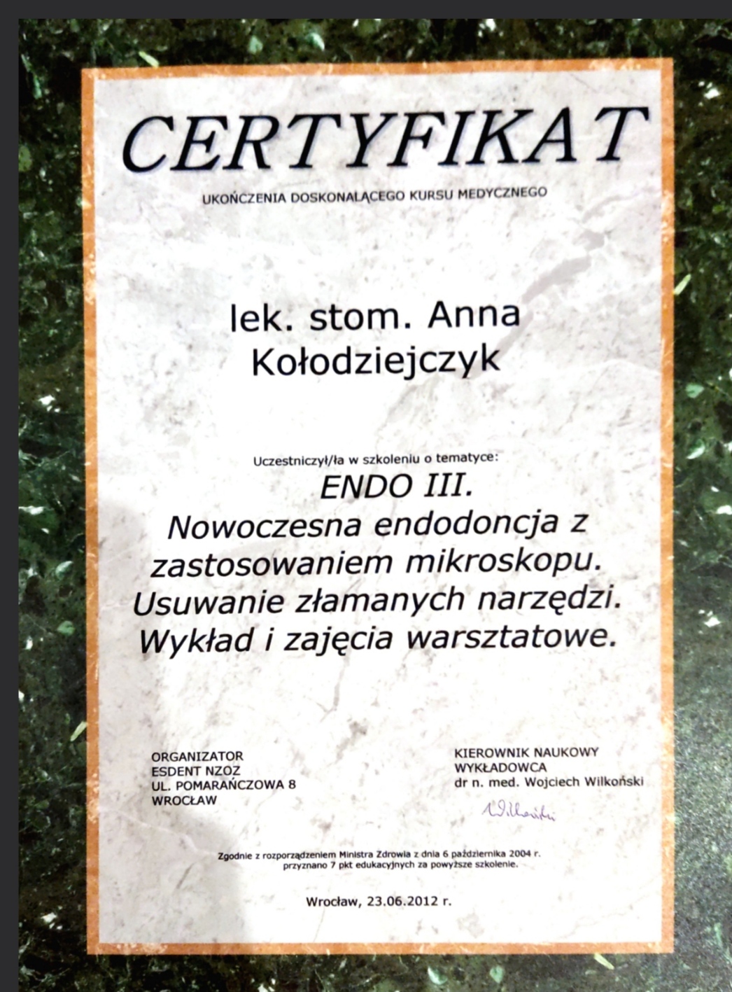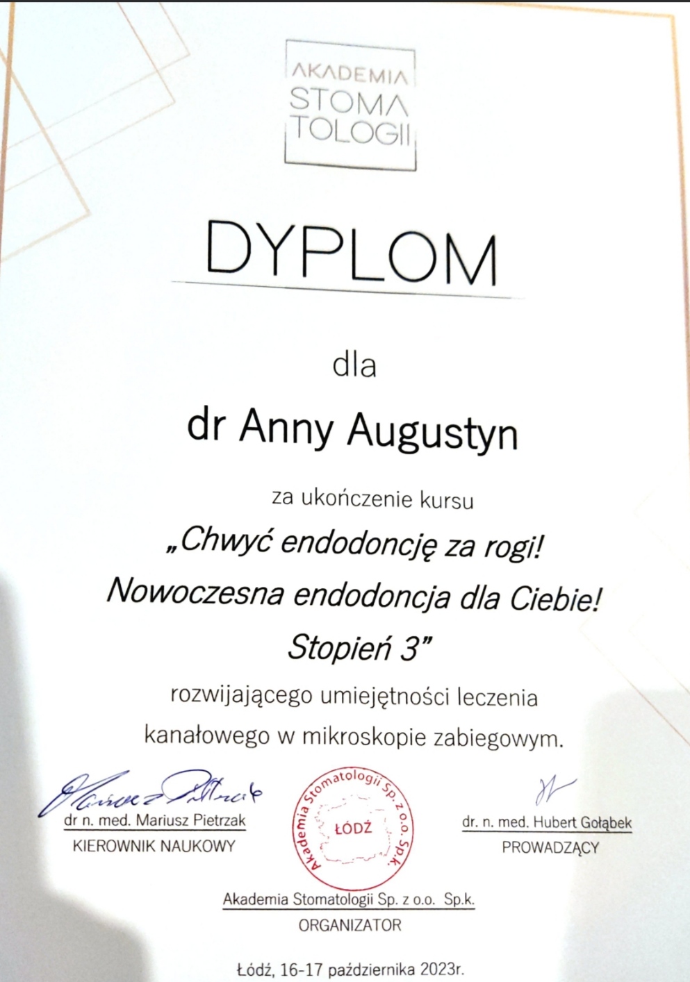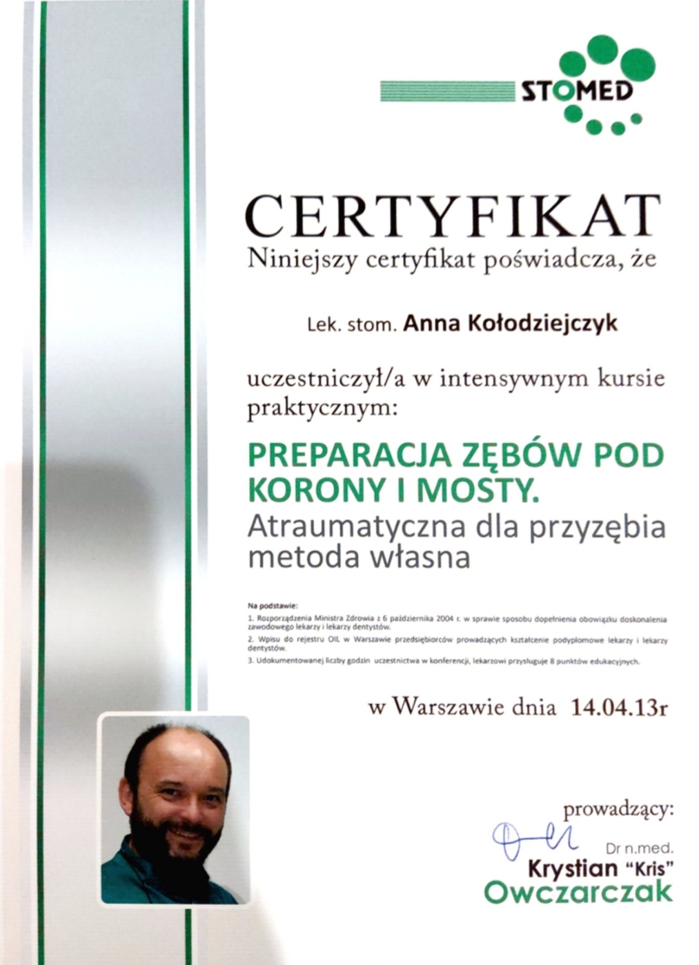 Stale podnosi swoje kwalifikacje na licznych szkoleniach szczególnie z zakresu endodoncji mikroskopowej nawet najtrudniejszych przypadków, stomatologii estetycznej oraz protetyki.