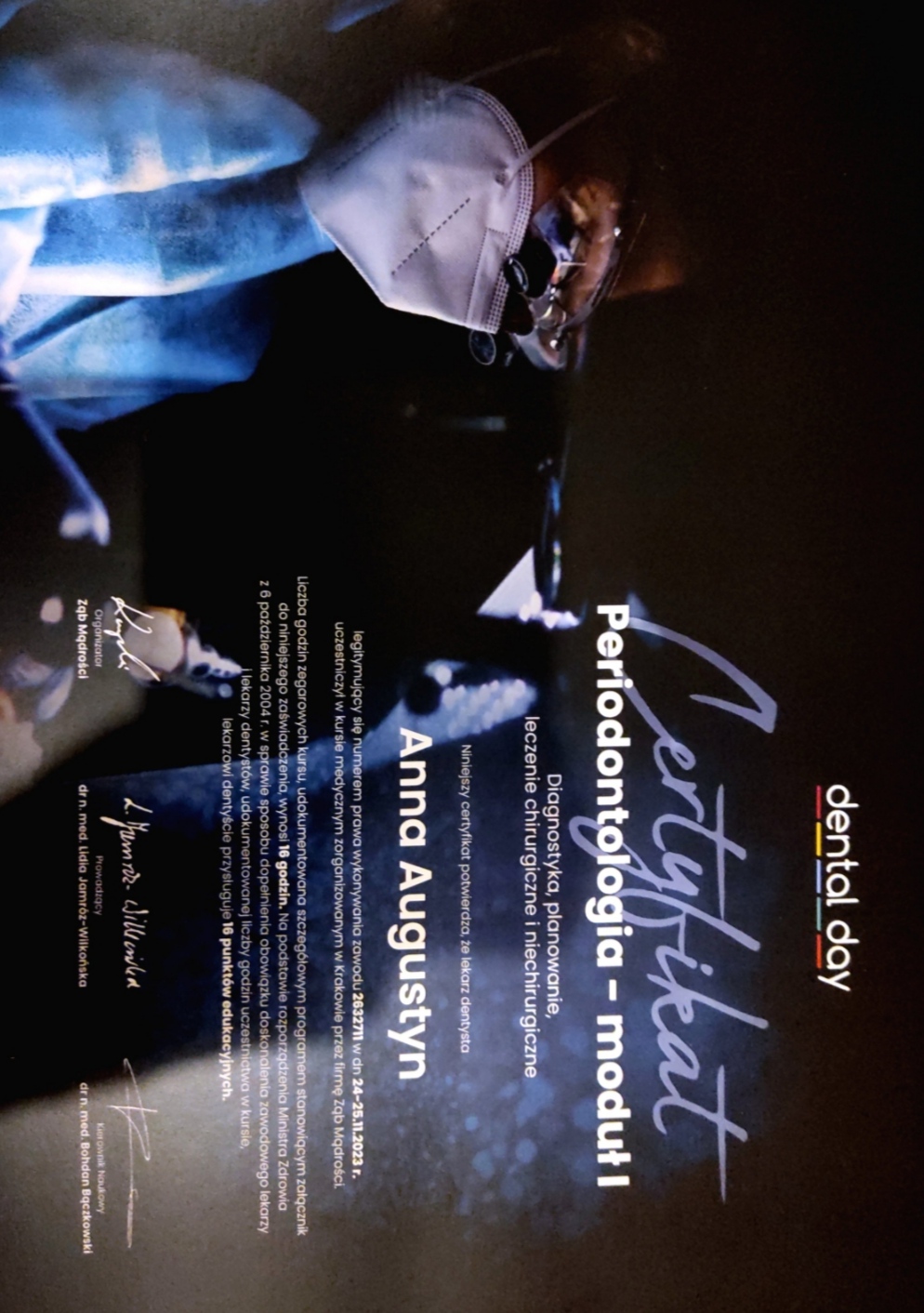 Ukończyła liczne kursy i szkolenia, stale podnosi swoje kwalifikacje. W naszym gabinecie koordynuje leczenie periodontologiczne pacjentów w terapii FMD i terapii fotodynamicznej.